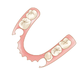 弾性のある特殊な樹脂を使用した部分入れ歯です。金属のバネを使用しないため、審美性に優れています。素材が軽く装着感も違和感が少ないのが特徴です。