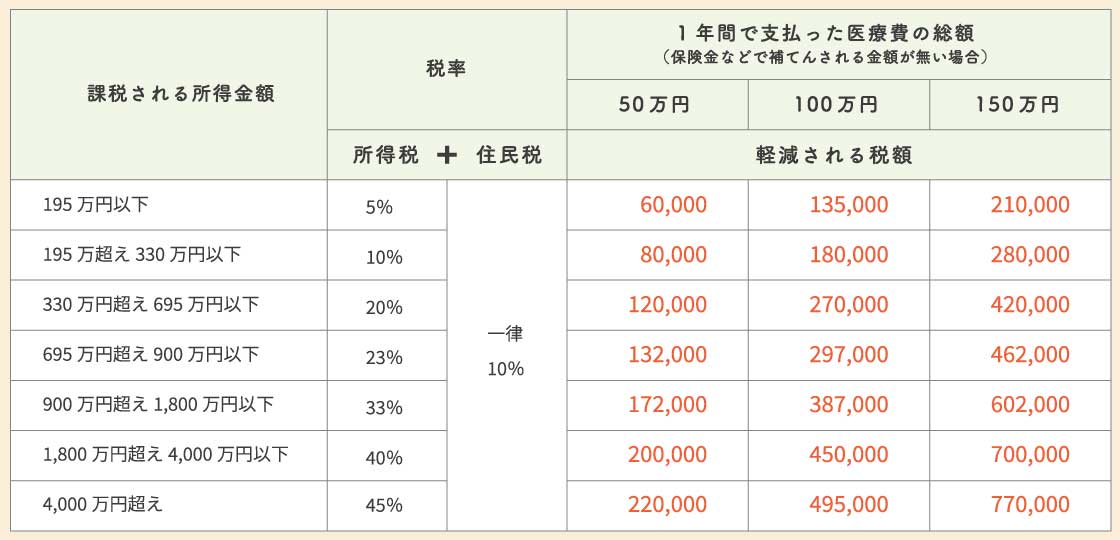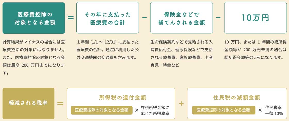 医療費控除とは、ご自身や、生計を一つにする配偶者、その他の親族のために1年間(1/1〜12/31)に支払った医療費の合計が10万円(総所得金額等が200万円未満の場合は、総所得金額等の5%の金額)を上回った場合、確定申告の手続きによって一定の金額を所得金額から控除できる制度です。また、過去の分についても、「申請したい年の源泉徴収票」「書類」「医療費の領収書」が揃っていれば過去5年間にさかのぼって医療費控除が受けられます。